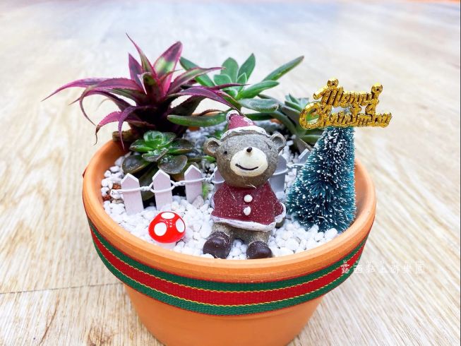 使用寬口徑透氣陶盆及多肉專用土、發揮巧思利用主題裝飾物搭配小型多肉植物來打造一個聖誕小花園景觀。