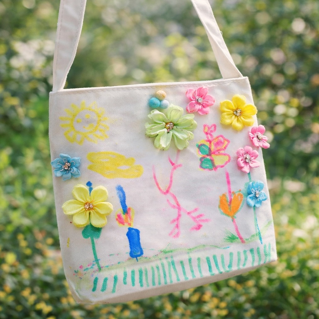 親子彩繪花花小提袋,搭配仿真花裝飾,輕鬆完成春日風格創作。